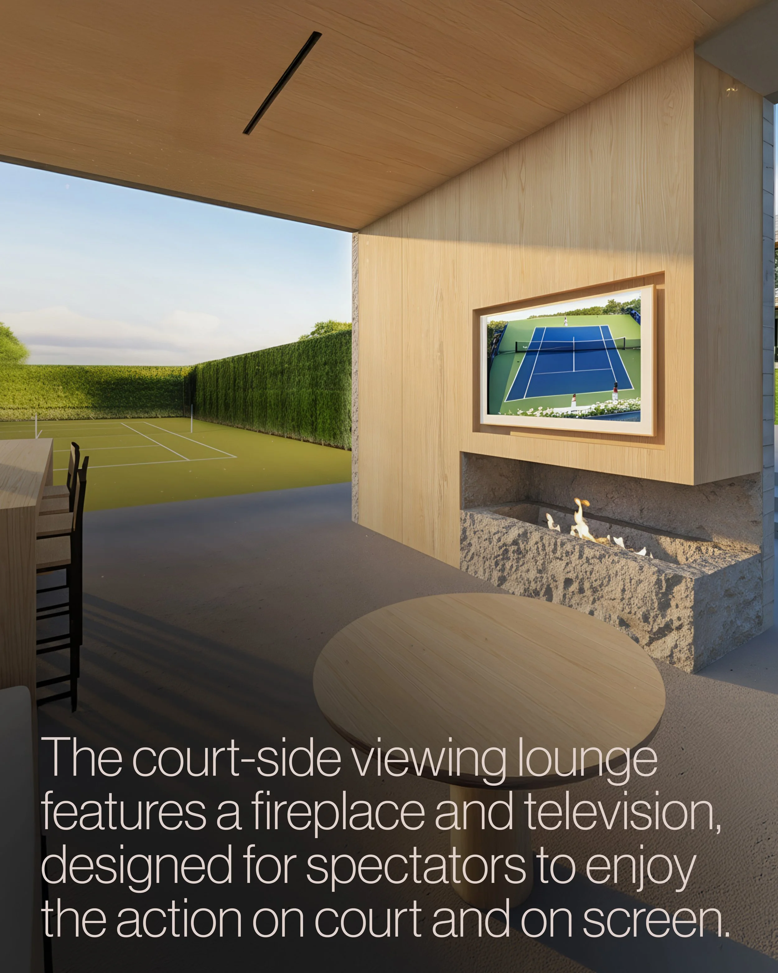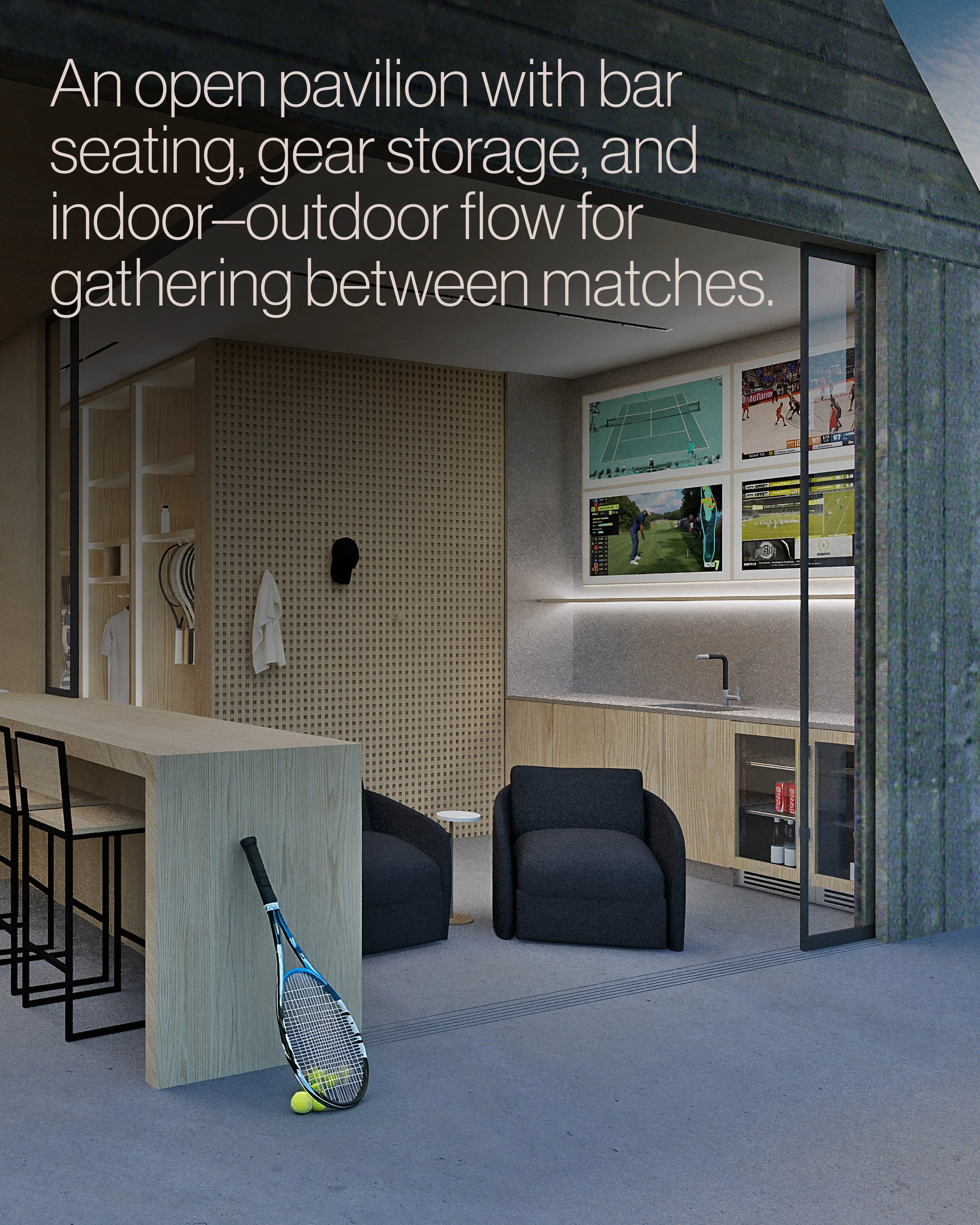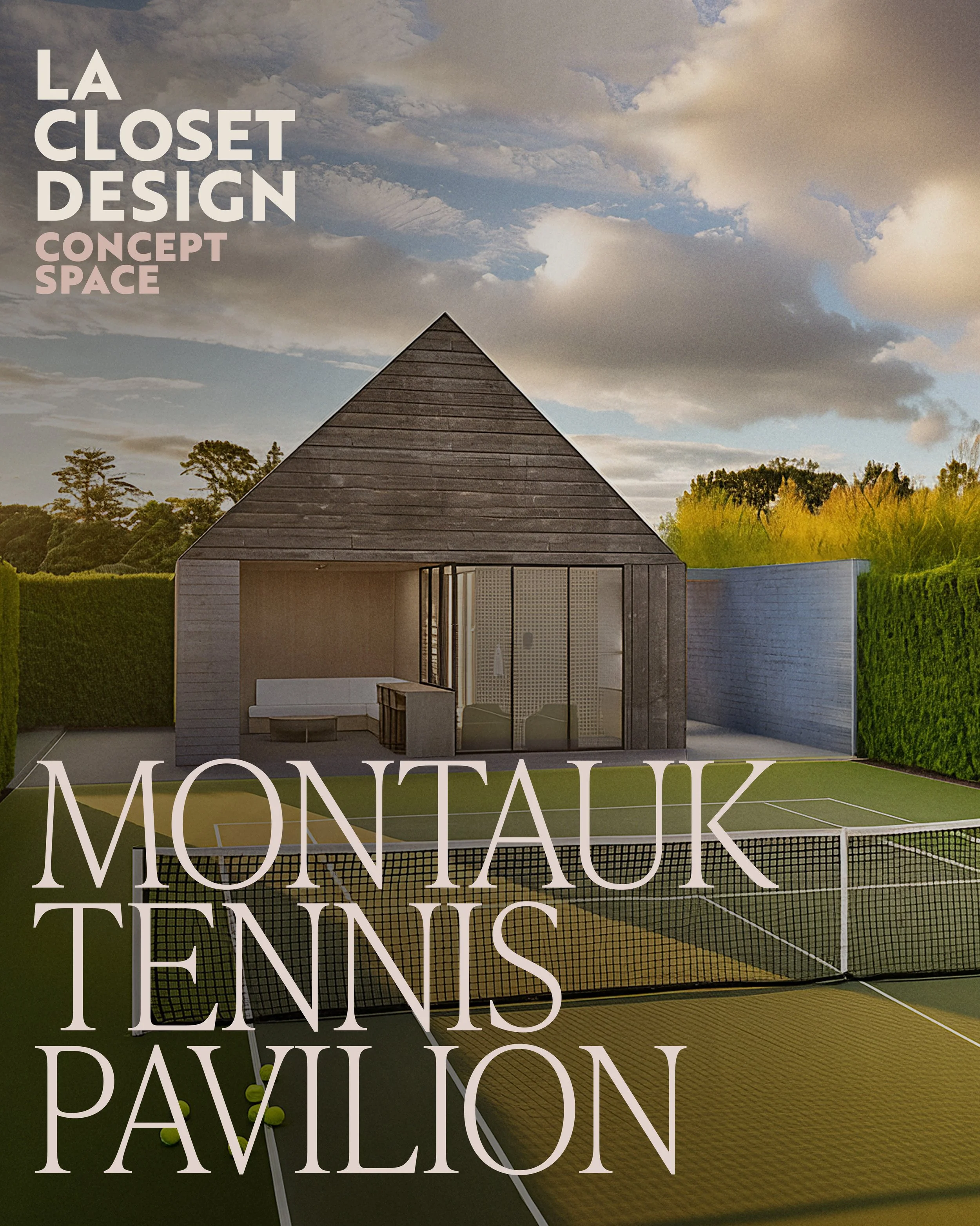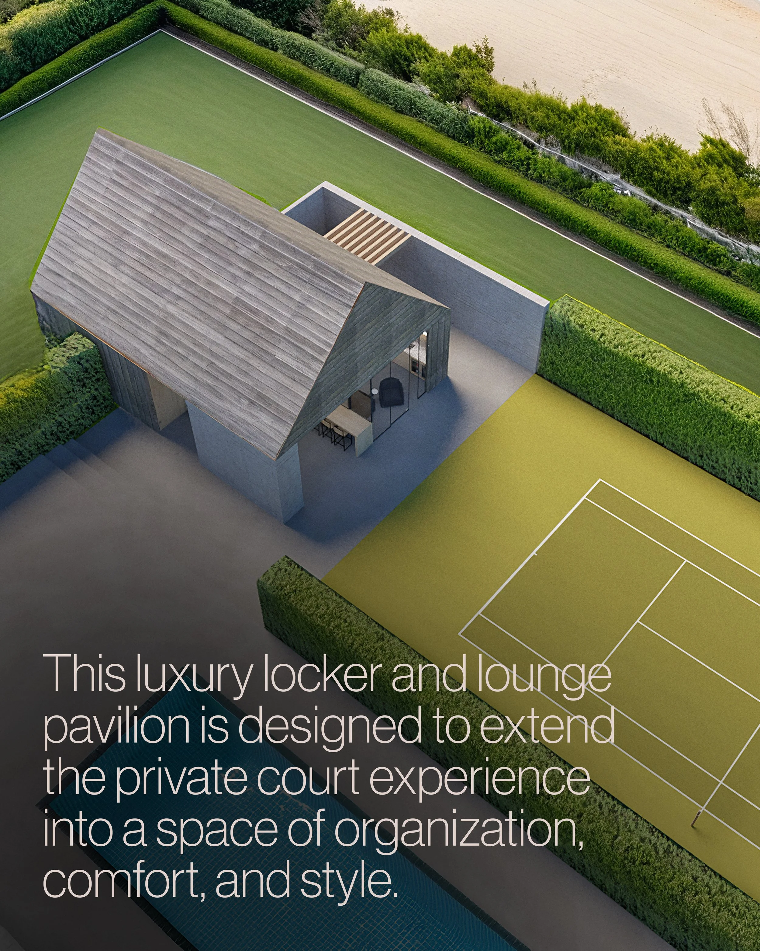 The Montauk Tennis Pavilion is a Scandinavian-modern interpretation of the seaside clubhouse—bleached oak, poured concrete, and glass framing views of the court and coast. Inside, a viewing lounge flows into an indoor-outdoor bar, spa, and training space, designed with the same precision and organization found in our luxury closets. Every racquet, towel, and tonic has its place—minimal, intentional, and quietly elevated.