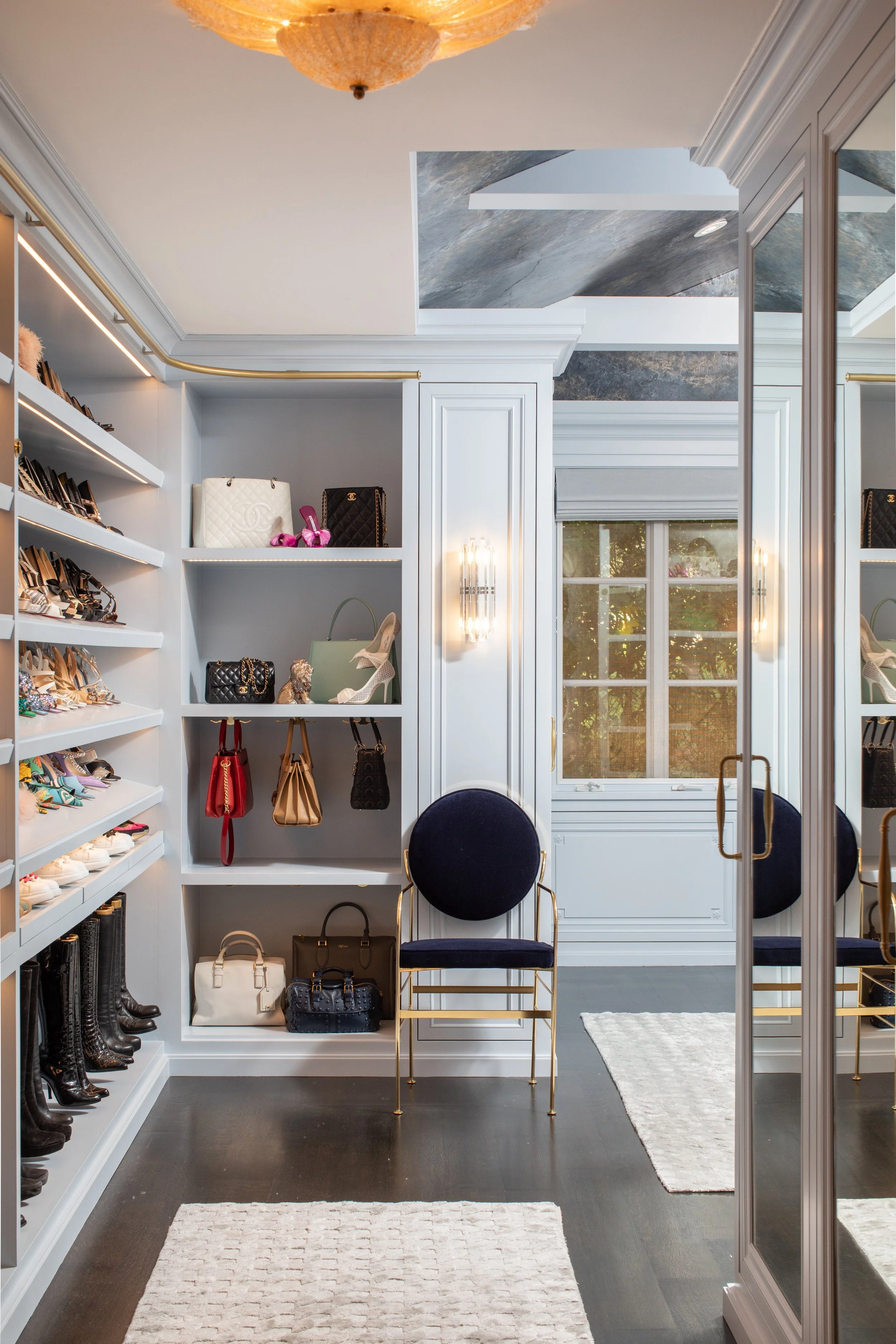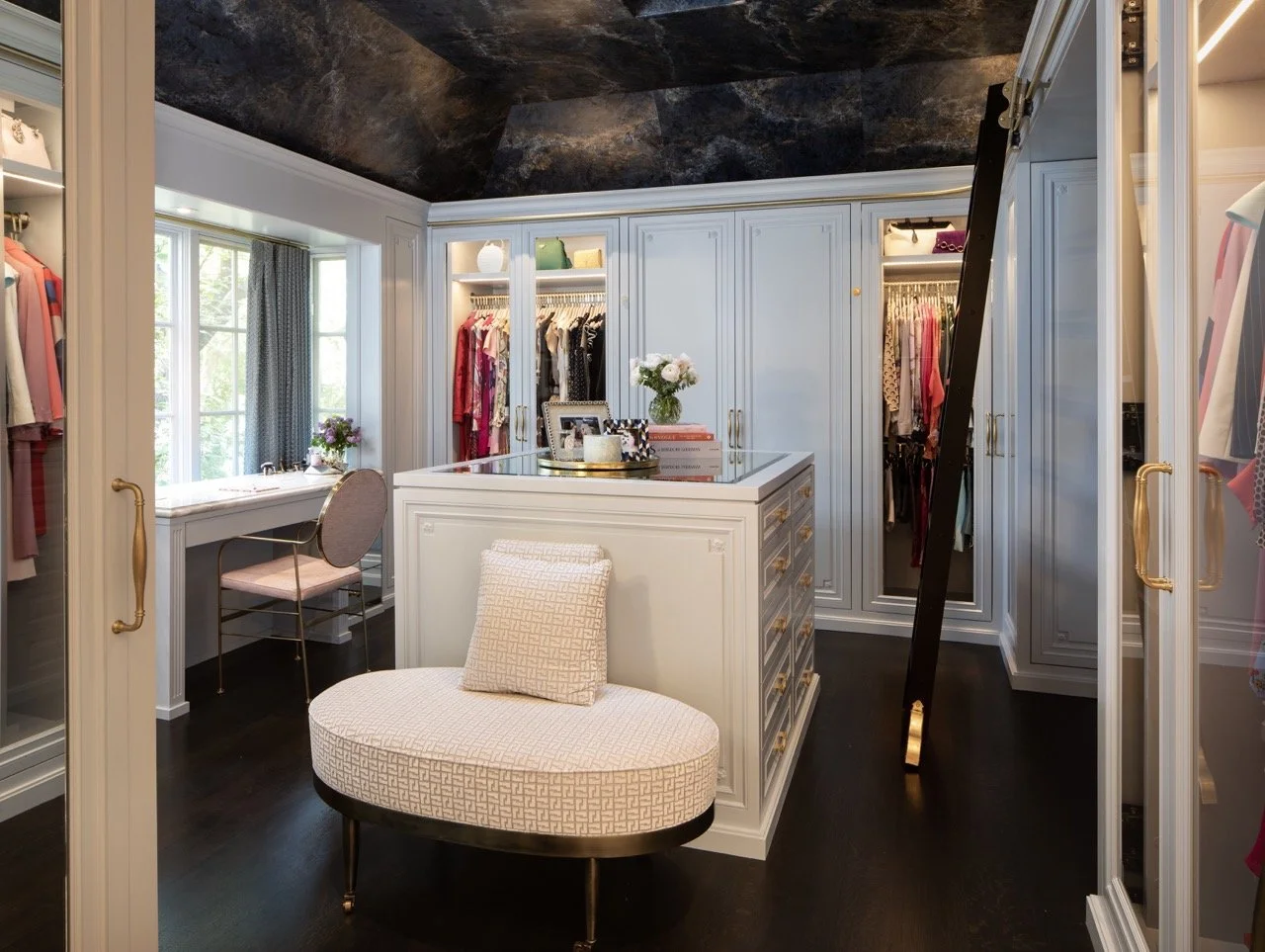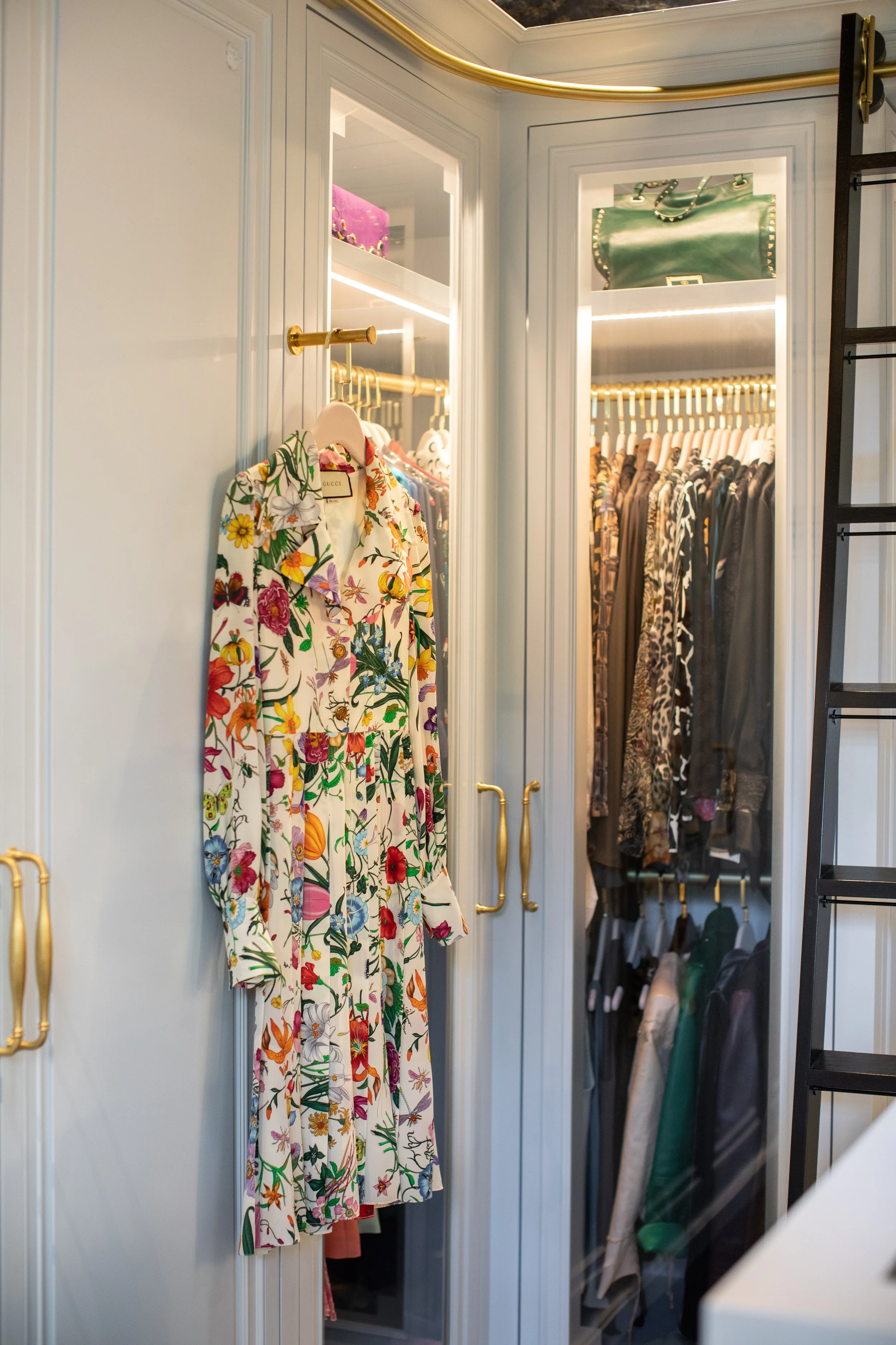 A study in color and craftsmanship, this project transformed two adjoining bedrooms into a single art-deco-inspired dressing suite. Finished in a custom blue lacquer with polished brass detailing and black contrasting library ladders, the space balances boldness and serenity—an intimate gallery for fashion and design.